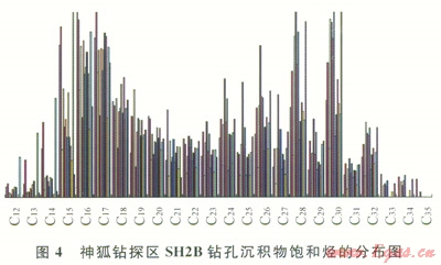 在南海北部陸坡淺表層沉積物有機(jī)質(zhì)中正構(gòu)烷烴基本為雙峰形,表現(xiàn)為海相浮游動(dòng)物、陸源高等植物混合母源特征。神狐鉆孑L沉積物有機(jī)質(zhì)正烷烴為雙峰形分布特征(圖4)。第一主峰碳數(shù)為C17~C19,代表海相浮游動(dòng)物和藻類,第二主峰碳數(shù)為C29或C31來源于陸源高等植物。其輕重?zé)N比值C21-/C22+介于0.06~5.73,有機(jī)質(zhì)d13C值為-17.3‰~-22.8‰,表明總體上以海相浮游動(dòng)物和藻類為主,局部存在陸源有機(jī)質(zhì)。鉆孔沉積物TOC介于0.29%~1.77%,各鉆孔頂部層段TOC明顯表現(xiàn)出在高值區(qū)振蕩變化特征,并隨深度的增加TOC值逐漸降低,而到一定深度后,TOC基本保持穩(wěn)定(圖5)。這種有機(jī)碳系統(tǒng)地向下減少是早期成巖階段有機(jī)質(zhì)氧化分解的結(jié)果[17]。由于鉆孔淺部沉積物埋藏時(shí)間短,有機(jī)質(zhì)消耗較少,TOC與沉積物中原始含量比較接近,平均值達(dá)1.2%;而下部層段的有機(jī)碳為經(jīng)過早期成巖階段硫酸鹽還原和微生物發(fā)酵而大量消耗后的穩(wěn)定殘留有機(jī)碳,有機(jī)碳轉(zhuǎn)化率在30%~61%,大多轉(zhuǎn)化為生物甲烷氣,是形成水合物的主要?dú)怏w來源。神狐鉆孔沉積物有機(jī)質(zhì)中含有豐富的烷基苯系列化合物,以短鏈的烷基苯同系物優(yōu)勢(shì)為特征,含少量對(duì)熱演化敏感的較長(zhǎng)鏈的烷基苯同系物,表明有機(jī)質(zhì)熱演化程度很低。此外,部分樣品中存在重排甾烷和4-甲基甾烷,是典型的微生物作用活動(dòng)標(biāo)志,這與鉆探證實(shí)的水合物主要為微生物氣特征是一致的。