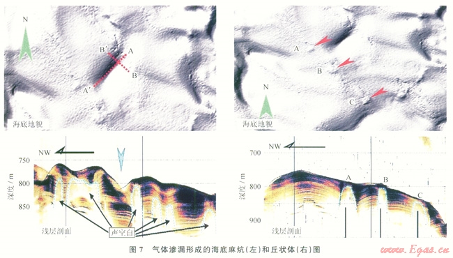 氣煙囪作為超壓流體泄壓的通道,將大量氣體運(yùn)移到淺部穩(wěn)定域中形成水合物礦藏,部分天然氣滲漏導(dǎo)致在海底形成冷泉噴口、麻坑、匠狀體、碳酸鹽巖匠等并引起海底微地貌的變化,在其周圍分布有大量如菌席、蠕蟲類、雙殼類等組成的以溢出天然氣為營(yíng)養(yǎng)源的生物組合。例如,在南海東北部陸坡廣泛發(fā)育海底麻坑、丘狀體、自生碳酸鹽巖結(jié)殼等微地貌標(biāo)志(圖7),表明該區(qū)存在著大規(guī)模的海底滲漏現(xiàn)象。2004年中德合作SO177航次在該海域也發(fā)現(xiàn)了大量的結(jié)核狀、結(jié)殼狀或管狀白生碳酸巖鹽和典型的化能生物群落(雙殼類生物和管狀蠕蟲類及厭氧菌席)。
