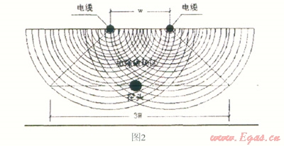 采用人工磁場(chǎng),即在穿越中心線兩側(cè)布設(shè)的閉合線圈,這樣所布線圈不受外部磁場(chǎng)的干擾,可以準(zhǔn)確無誤的將鉆孔數(shù)據(jù)反映出來,當(dāng)探頭到達(dá)此閉合的線圈區(qū)域內(nèi),接通直流電源產(chǎn)生磁場(chǎng),通過人工磁場(chǎng)可以測(cè)得穿越軸線的左右偏移和穿越標(biāo)高(如圖2,W為單位寬度)。由于人工磁場(chǎng)受干擾較小,可以提供準(zhǔn)確的管線穿越方位角,從而能夠很好的控制導(dǎo)向孔與設(shè)計(jì)穿越曲線偏移,并能保證穿越曲線的平滑性。