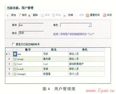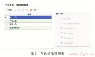 該系統(tǒng)分為角色管理、角色權(quán)限管理以及用戶管理3個(gè)部分。角色管理把使用系統(tǒng)的人員分為設(shè)計(jì)人員、審核人員、審批人員和基礎(chǔ)數(shù)據(jù)維護(hù)員(圖2)。這些人員能進(jìn)行的業(yè)務(wù)處理和所能查看的數(shù)據(jù)范圍各不相同,系統(tǒng)需要為每一個(gè)操作人員設(shè)立不同的賬號(hào),系統(tǒng)為每個(gè)角色分配相應(yīng)的操作權(quán)限(圖3)。