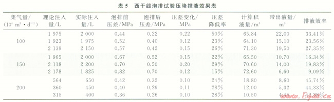 根據(jù)西干線泡排實(shí)驗(yàn)數(shù)據(jù),評(píng)價(jià)泡排前后的壓差和排液效果變化,試驗(yàn)壓降和攜液結(jié)果見表5。從表5可以看出:①隨著泡排劑的注入,輸送壓差總體呈現(xiàn)下降趨勢(shì),如果實(shí)際注入量小于理論注入量,則導(dǎo)致降壓效果不佳;②在相同集氣量下,注入泡排劑量越大,壓降效果越顯著;③在相同的泡排劑注入量下,壓降與集氣量密切相關(guān),在100×104m3集氣量下,壓降為0.22MPa,集氣量為150×104m3時(shí),最大壓降為0.20MPa,在200×104m3集氣量下,最大壓降為0.11MPa,分析認(rèn)為集氣量大,氣流速度快,泡排劑與積液的作用時(shí)間短,進(jìn)一步優(yōu)化注入量與集氣量、注入時(shí)間及注入制度之間的關(guān)系,確保泡排劑與積液的充分作用,以進(jìn)一步提高泡排效果。
