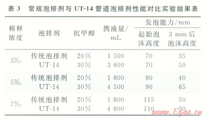 目前國(guó)內(nèi)外所使用的泡沫劑為了減少礦化度、溫度對(duì)其排液效果的影響,基本上采用陰離子表面活性劑[17],由于西干線管線積液(表2)中有大量的甲醇和凝析油,其為擴(kuò)散能力很強(qiáng)的低分子量物質(zhì),它的存在將加快泡排劑泡沫表面的排液速度,使得泡排劑產(chǎn)生的泡沫極不穩(wěn)定,很容易破滅。為此,對(duì)管線泡沫排水劑配方研究從以下兩方面進(jìn)行:①為了消除甲醇對(duì)發(fā)泡劑泡沫穩(wěn)定性的影響,對(duì)活性劑進(jìn)行篩選,選用泡沫壁相對(duì)較厚且泡沫形狀呈菱形穩(wěn)定結(jié)構(gòu)的活性劑作為泡沫排水劑的發(fā)泡成分,并且加入增溶劑,以增大活性劑在配方中的溶解度,使得配方中有效發(fā)泡成分大大增加,以消除抗凍劑對(duì)泡沫排水劑發(fā)泡、帶液能力的影響;②在發(fā)泡劑分子上引入羧基基團(tuán),讓這種網(wǎng)狀基團(tuán)阻礙或減慢甲醇這類擴(kuò)散劑分子侵入發(fā)泡劑泡沫表面,減慢或消除甲醇對(duì)發(fā)泡劑泡沫排液的影響。取西干線清管的水樣,通過系列室內(nèi)實(shí)驗(yàn),研制出管道高抗醇、抗油的管道泡排劑UT-14,3種活性劑(a:油患子精華素;b:聚乙二醇;c:三乙醇胺)的最佳配制比例為:a:b:c=10:4:1,其發(fā)泡能力(泡沫高度)達(dá)到150mm,5min后也能保持在120mm。參照泡排劑評(píng)價(jià)相關(guān)標(biāo)準(zhǔn),開展常規(guī)泡排劑與新研制泡排劑UT-14對(duì)比實(shí)驗(yàn),實(shí)驗(yàn)結(jié)果見表3,由此叮以看出,管道泡排劑UT-14抗醇、抗油能力較好,現(xiàn)場(chǎng)使用濃度(體積分?jǐn)?shù))為3.00‰~5.00‰,該濃度泡排劑加注后不會(huì)對(duì)下游分離沒備、管線造成影響。