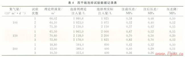 在西干線100×104m3/d、150×104m3/d、200×104m3/d不同氣量下進(jìn)行現(xiàn)場(chǎng)試驗(yàn),在一周期試驗(yàn)結(jié)束壓差下降后,持續(xù)生產(chǎn)一段時(shí)間管線進(jìn)出口壓差回升時(shí),繼續(xù)注入泡排劑,如此反得周期性注入,探索泡排劑作用周期,形成給定氣量下的泡排劑加注制度。試驗(yàn)前,利用上述管道積液量計(jì)算理論計(jì)算西干線給定氣量、壓差下積液量,根據(jù)泡排劑室內(nèi)實(shí)驗(yàn)的加注深度,計(jì)算出的理論注入量,實(shí)驗(yàn)參數(shù)及結(jié)果見表4.