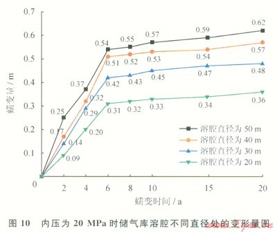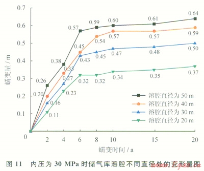 根據(jù)模擬計(jì)算所得結(jié)果,可以得到不同壓力下儲(chǔ)氣庫(kù)溶腔不同直徑處變形量圖(圖9~11),經(jīng)總結(jié)分析,僅列出具有代表性的分析圖。圖9~11分別表示溶腔內(nèi)壓為10MPa、20MPa、30MPa時(shí),不同蠕變時(shí)間鹽穴儲(chǔ)氣庫(kù)溶腔不同直徑處的變形量。
