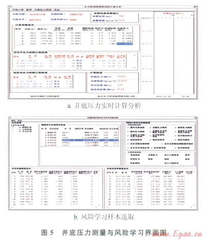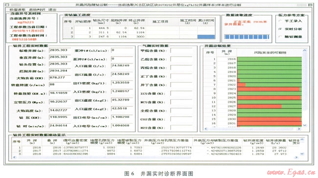 在我國某油田鉆井時,應用鉆井風險控制系統(tǒng)實時診斷鉆井狀態(tài),分別對鉆井實時數(shù)據(jù)采集軟件、鉆井實時數(shù)據(jù)庫管理軟件、鉆井風險因素實時計算分析軟件和鉆井風險推理風險軟件進行現(xiàn)場測試(圖5、6)。以采集的鉆井實時數(shù)據(jù)為基礎,應用鉆井風險因素實時分析軟件計算井底壓力和地層壓力等參數(shù),以鄰井資料作為井漏風險學習的樣本,判斷該井井漏風險,系統(tǒng)判斷該井在鉆至2823m時井漏風險可能性較大,當鉆進至2825m時技術人員發(fā)現(xiàn)井底發(fā)生漏失,決定進行起鉆堵漏作業(yè)?,F(xiàn)場測試表明鉆井風險控制系統(tǒng)的數(shù)據(jù)采集軟件與儀器測量儀器同步性好,數(shù)據(jù)庫設計合理,且井漏風險實時診斷預測結果與現(xiàn)場完全吻合。