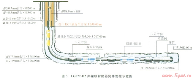 2)前期井眼準備和送入完井管柱過程中容易卡鉆,尤其在裸眼封隔器完井管柱入井后中途坐封且處于淺井段情況下,網懸掛封隔器以下可能圈閉上竄氣體,處理時容易造成上頂或氣竄的井控風險。如:L002-5-X2井下完井管柱至1091.61m遇阻并中途坐封,懸掛封隔器坐封位置在井深20.27m。