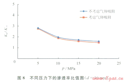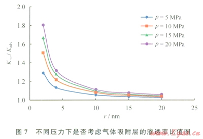 根據(jù)式(8),可以計(jì)算出不同的壓力下孔隙受到吸附層影響之后的實(shí)際有效孔隙半徑,利用有效半徑和實(shí)際半徑,再用式(9)可計(jì)算出吸附層對其滲透率的影響程度。圖7為不同的壓力和孔隙直徑下,孔隙的固有滲透率同存在吸附層時(shí)的滲透率比值,此時(shí)假設(shè)Langmuir壓力為12.5MPa,這里所計(jì)算的滲透率均為等效液體滲透率,也就是不考慮氣體滑脫效應(yīng)。