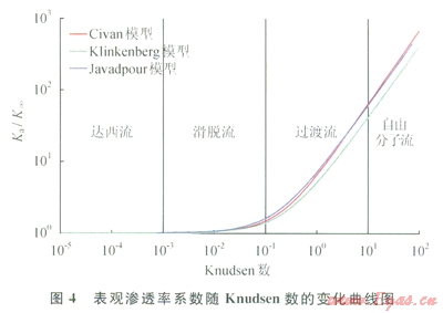 圖4為采用3種不同的模型時(shí),Ka/K∞隨著Knudsen數(shù)的變化曲線??梢钥闯觯涸陴ば粤麟A段,表觀滲透率等于絕對滲透率;在滑脫流階段,隨著Knudsen數(shù)的增大,逐漸地變大,滑脫的存在使表觀滲透率增加,3種模型在滑脫流階段的計(jì)算結(jié)果基本趨于一致;當(dāng)出現(xiàn)過渡流時(shí),3種模型的計(jì)算結(jié)果出現(xiàn)了較大的偏差,其中Civan模型和Javadpour模型結(jié)果較為接近,而Klinkenberg的模型則明顯的小于前兩者,這說明Klinkenber模型不再適用于過渡流階段流動(dòng)規(guī)律的描述,該模型低估了過渡流階段的表觀滲透率。