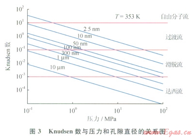 假定氣藏溫度為353K,圖3給出了不同的壓力條件下,甲烷氣在不同級別的孔隙中流動(dòng)時(shí)的Knudsen數(shù),圖3中右側(cè)給出了不同的流態(tài)的界限,可以看出:頁巖納米孔隙中的主要流態(tài)是滑脫流和過渡流。
