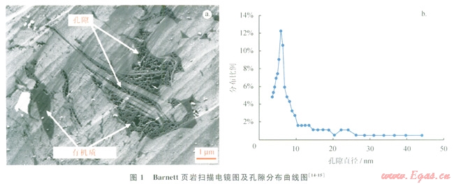 對于大部分的頁巖,其孔隙半徑比常規(guī)儲層要低得多,圖1-a為Barnett頁巖不同樣品的掃描電鏡圖像,可以看出,頁巖基質(zhì)主要由黏土礦物(淺灰色物質(zhì))和有機(jī)質(zhì)或干酪根組成(深灰色物質(zhì)),孔隙主要分布在有機(jī)質(zhì)中,且這些孔隙主要是納米孔隙。圖1-b所示為通過壓汞法所測得的一個(gè)Barnett頁巖的孔隙大小分布曲線,其主要孔隙半徑分布范圍在10nm以下。2010年,鄒才能等人在中國頁巖儲層發(fā)現(xiàn)納米級孔隙[12-13],指出頁巖氣儲層納米級孔隙以有機(jī)質(zhì)內(nèi)孔、顆粒內(nèi)孔及白生礦物品間孔為主,孔隙直徑范圍為5~300nm,主體為80~200nm。