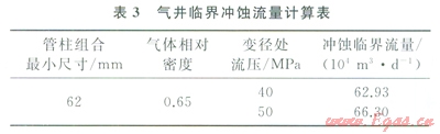 根據(jù)“氣井生產(chǎn)系統(tǒng)分析”系統(tǒng)的分析,完井油管采用Æ89mm或Æ89mm+Æ73mm的復合油管能夠滿足攜液、抗沖蝕及增產(chǎn)要求(表2、3)。
