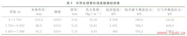 考慮到井筒條件,只能采用Gl05鋼級的Æ101.6mm、Æ88.9mm、Æ73.0mm/Æ60.3mm新鉆桿進行通井作業(yè)。其參數(shù)及強度校核如表5所示。