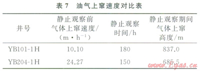 元壩氣田在YB101-1H、YB204-1H井投產(chǎn)中進行了試驗,在YB101-1H靜止觀察前測得氣體上竄速度為10.1m/h,靜止觀察180h后,氣體上移距離837m;在YB204-1H井中靜止觀察前測得氣體上竄速度為24.27m/h,靜止觀察150h后,氣體上移距離685.5m,氣體上竄速度均沒有明顯增加,驗證了氣體在壓井液中的運行規(guī)律(表7)。實踐證明,通過短起下測油氣上竄速度能夠滿足下完井投產(chǎn)管柱的井控需要。