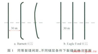 隨著工具設(shè)備及水平井改造技術(shù)的不斷進步,儲層多段改造的規(guī)模、段數(shù)等越來越多[8-9]。水力壓裂沒計師可利用分簇射孔將分段改造距離設(shè)置得越來越近,但往往過多的分簇與分段未必就帶來理想的效果,Roussel認為應(yīng)力陰影效應(yīng)的產(chǎn)生機理主要在于支撐劑的填充導(dǎo)致人工裂縫附近引起了應(yīng)力場的變化,蔣廷學(xué)等也在研究我國頁巖氣壓裂設(shè)計中指出,壓裂在單一裂縫脆弱面上產(chǎn)生誘導(dǎo)應(yīng)力的存在,并指出產(chǎn)生應(yīng)力陰影的誘導(dǎo)應(yīng)力可以改變最大與最小主應(yīng)力的分布,使裂縫發(fā)生轉(zhuǎn)向[10]。述研究表明,應(yīng)力陰影效應(yīng)可引起人工裂縫從水平井的橫切縫中開始偏離朝向或遠離以前的裂縫方向延伸,使得下一裂縫發(fā)生轉(zhuǎn)向。Barnctt頁巖裂縫間距30m時水平井壓裂裂縫產(chǎn)生的應(yīng)力陰影效應(yīng)如圖1-a所示,可見從第二條裂縫開始裂縫出現(xiàn)了與主縫向切的裂縫系統(tǒng),而Eagle Ford頁巖壓裂的裂縫監(jiān)測情況,同樣是30m的裂縫間距沒有出現(xiàn)裂縫應(yīng)力陰影效應(yīng)(圖1-b)。因此研究陰影效應(yīng)的產(chǎn)生機理,建立分析數(shù)學(xué)模型并進行其影響因素分析對水平井分段體積改造優(yōu)化設(shè)計及效果的提升具有重要研究與應(yīng)用價值。