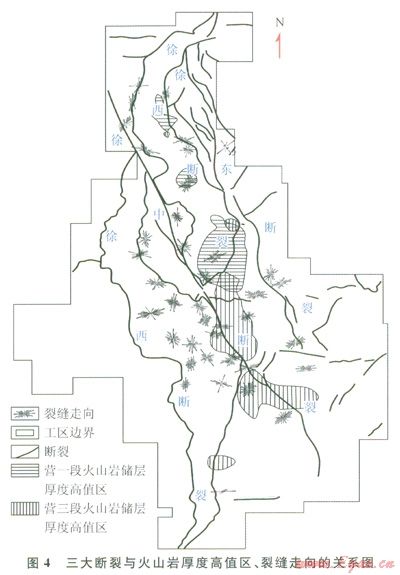 由圖4中可以看出,由徐家圍子斷陷56口井成像測(cè)井資料揭示的火山巖裂縫性儲(chǔ)層發(fā)育區(qū)主要受到三大斷裂的控制,其中徐中斷裂附近營(yíng)城組火山巖中裂縫最發(fā)育,尤其是中南部,其次是徐西斷裂南段中部火山巖裂縫較發(fā)育;最少的是徐東斷裂附近火山巖,裂縫相對(duì)不發(fā)育。這主要是由于三條斷裂活動(dòng)強(qiáng)度和性質(zhì)不同造成的,徐中斷裂不僅活動(dòng)強(qiáng)烈,而且為走滑斷裂,伴隨其活動(dòng)過(guò)程,附近的營(yíng)城組火山巖體內(nèi)形成大量裂縫。徐西斷裂雖然活動(dòng)也較強(qiáng)烈,但因不具走滑性質(zhì),活動(dòng)過(guò)程中在其附近形成的裂縫數(shù)量明顯少于在徐中斷裂附近的營(yíng)城組火山巖體內(nèi)形成的裂縫數(shù)量。徐東斷裂活動(dòng)強(qiáng)度明顯較徐中、徐西斷裂弱,雖然其也為走滑斷裂,活動(dòng)過(guò)程中在其附近的營(yíng)城組火山巖體內(nèi)形成的裂縫數(shù)量也明顯較前兩者少。