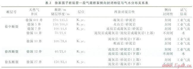 由表l中可以看出,徐家圍子斷陷日前已發(fā)現(xiàn)的氣藏,如徐深1—徐深6井區(qū)、徐深7井區(qū)、徐深41徐深l7井區(qū)、徐深14—徐深l2井區(qū)、徐深12井區(qū)、徐深27井區(qū)、徐深9井區(qū)、徐深l3—肇深11井區(qū)營(yíng)一段火山巖氣藏皆為受三大斷裂遮擋形成的氣藏,其在天然氣運(yùn)聚成藏期——青山口組沉積之后至今在側(cè)向上是否封閉是決定氣藏能否形成的關(guān)鍵。