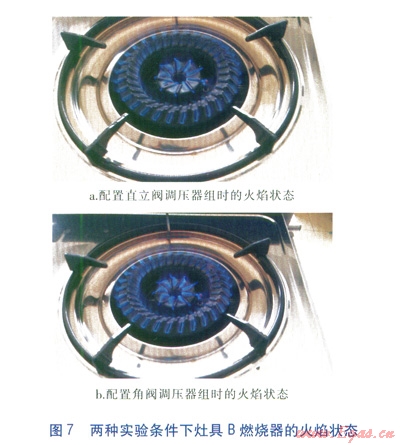 由實(shí)驗(yàn)結(jié)果可知,灶具A、C燃燒器的火焰狀態(tài)基本相同,但灶具B燃燒器的火焰狀態(tài)區(qū)別較大,見圖7。由圖7可知,配置直立閥調(diào)壓器組時(shí),燃燒器火焰較弱;配置角閥調(diào)壓器組時(shí),火焰為淡藍(lán)色,表明燃燒充分,且火焰有向上的沖力。由此可知,在實(shí)驗(yàn)條件接近的情況下,配置角閥調(diào)壓器組時(shí),灶具B燃燒器的火焰狀態(tài)更好。