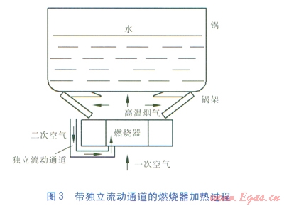 為提高火焰溫度,降低過剩空氣系數(shù),改善二次空氣補(bǔ)充狀況,在燃燒器引射能力較好、一次空氣系數(shù)較大的情況下,主要考慮二次空氣補(bǔ)充的區(qū)域設(shè)計。二次空氣入口面積受布置空間、火焰狀態(tài)、煙氣中CO含量等因素的限制,燃燒器結(jié)構(gòu)較難做出大的改善。為了減少高溫?zé)煔馀c二次空氣流動的互相干擾,我們采取了將高溫?zé)煔馀c二次空氣互相隔離、形成獨(dú)立流動通道的創(chuàng)新方法,設(shè)計一個結(jié)構(gòu)件作為二次空氣的獨(dú)立流動通道。帶獨(dú)立流動通道的燃燒器加熱過程見圖3。高溫?zé)煔馀c二次空氣通過一個特殊的爐架分隔,高溫?zé)煔鈴臓t架上方排出,二次空氣從爐架下方吸入,經(jīng)過獨(dú)立流動通道補(bǔ)充至燃燒器。