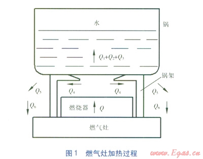 家用燃?xì)庠顭嵝适窃跇?biāo)準(zhǔn)試驗(yàn)條件下,有效利用的熱量在燃?xì)馊紵尫趴偀崃恐兴嫉谋壤?,即燃?xì)饽茉吹睦寐?,是衡量家用燃?xì)庠钍欠窆?jié)能的關(guān)鍵指標(biāo)。我們以GB16410—2007《家用燃?xì)庠罹摺芬?guī)定的標(biāo)準(zhǔn)試驗(yàn)條件下的燃?xì)庠詈驮囼?yàn)用鍋?zhàn)鳛檠芯繉ο螅治鋈細(xì)庠畹募訜徇^程(見圖1)。
