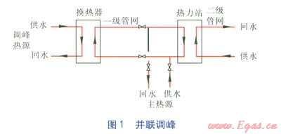 這種方式是目前國(guó)內(nèi)常見的調(diào)峰形式,考慮調(diào)峰熱源的相對(duì)位置及容量大小,又可細(xì)分為裂解調(diào)峰(調(diào)峰熱源與主熱源分別運(yùn)行)和并聯(lián)調(diào)峰(見圖1)。并聯(lián)調(diào)峰是調(diào)峰熱源高溫?zé)崴M(jìn)入換熱器與主熱源一級(jí)管網(wǎng)循環(huán)水進(jìn)行熱交換,使一級(jí)管網(wǎng)循環(huán)水升溫后輸送至各熱力站,與二級(jí)管網(wǎng)換熱。調(diào)峰熱源處于管網(wǎng)前端時(shí),適宜裂解調(diào)峰;調(diào)峰熱源處于管網(wǎng)水力工況薄弱點(diǎn)時(shí)適宜并聯(lián)調(diào)峰,在滿足熱負(fù)荷的前提下,能改善管網(wǎng)末端水力工況。