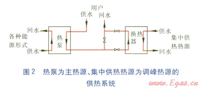 當(dāng)今,多熱源熱泵技術(shù)日臻成熟,太陽(yáng)能、風(fēng)能、污水、土壤等眾多熱源均可作為低品質(zhì)熱源,通過熱泵轉(zhuǎn)換為高品質(zhì)熱源供熱。因此,在天津市能源集團(tuán)“全市一網(wǎng)”戰(zhàn)略部署中,設(shè)置大型熱泵能源站,以熱泵為主熱源承擔(dān)廣大熱用戶的基本負(fù)荷,以集中供熱的熱水為調(diào)峰熱源,在尖峰時(shí)段加熱熱泵低溫?zé)崴?,充分利用熱泵能源的同時(shí),也大大減小了集中供熱的一級(jí)管網(wǎng)流量,為實(shí)現(xiàn)集中供熱大規(guī)?;⒏嗟?fù)屨脊崾袌?chǎng)份額起到了至關(guān)重要的作用。熱泵為主熱源、集中供熱熱源為調(diào)峰熱源的供熱系統(tǒng)見圖2。