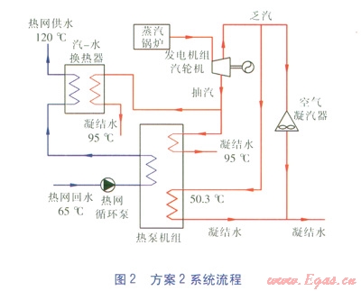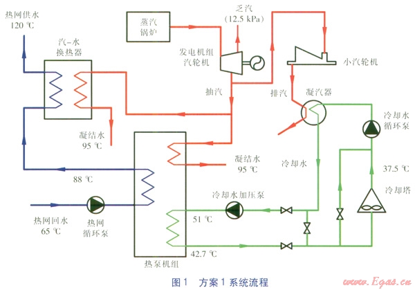 發(fā)電機(jī)組汽輪機(jī)抽汽作為熱泵機(jī)組驅(qū)動蒸汽,低溫?zé)嵩礊樾∑啓C(jī)凝汽器冷卻水余熱。方案1的系統(tǒng)流程見圖1。系統(tǒng)流程可分為3個(gè)分項(xiàng)流程:a.熱網(wǎng)循環(huán)水流程:熱網(wǎng)回水65℃,經(jīng)熱泵機(jī)組加熱至88℃后,進(jìn)入汽—水換熱器加熱至l20℃作為熱網(wǎng)供水。b.發(fā)電機(jī)組汽輪機(jī)抽汽流程:不考慮小汽輪機(jī)用汽,發(fā)電機(jī)組汽輪機(jī)抽汽分為兩部分,一部分作為熱泵機(jī)組驅(qū)動蒸汽,另一部分進(jìn)入汽—水換熱器加熱熱網(wǎng)回水,兩部分凝結(jié)水溫度均為95℃,并由汽動給水泵加壓輸送回蒸汽鍋爐。c.凝汽器冷卻水流程:小汽輪機(jī)凝汽器出口冷卻水溫度為51℃,作為熱泵機(jī)組低溫?zé)嵩矗酂崂煤鬁囟冉抵?span lang="EN-US">42.7℃,經(jīng)冷卻塔進(jìn)一步降溫后(冷卻塔出水溫度為37.5℃)進(jìn)入凝汽器。