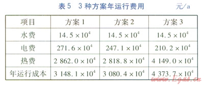 3種方案年運(yùn)行費(fèi)用見表5。水價(jià)按2元/t計(jì)算,電價(jià)按0.3707元/(kW·h)計(jì)算,蒸汽熱價(jià)按18元/GJ計(jì)算。由表3可知,方案1的系統(tǒng)造價(jià)最高,其次為方案2,方案3的系統(tǒng)造價(jià)最低。由表5可知,方案2的年運(yùn)行費(fèi)用最低,其次為方案1,方案3的年運(yùn)行費(fèi)用最高。將方案3作為對比方案,方案1、2高出的系統(tǒng)造價(jià),分別在2.8、2.4a時(shí)可以收回??紤]年運(yùn)行費(fèi)用,方案1、2的整體經(jīng)濟(jì)性優(yōu)于方案3,且方案1、2的差距不大。