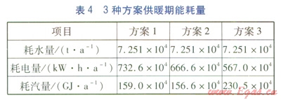 3種方案的造價(jià)見表3,供暖期能耗量見表4。