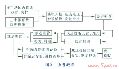 本工程開(kāi)工后首先應(yīng)進(jìn)行施工場(chǎng)地內(nèi)管線改移、防護(hù),進(jìn)行止水帷幕及防護(hù)樁施工。本工程屬于深基坑工程,為保證施工過(guò)程中基坑(包括頂進(jìn)工作坑和接收工作坑)的安全,必須確保防護(hù)樁的施工質(zhì)量?;臃雷o(hù)樁完成后,進(jìn)行基坑開(kāi)挖、基底處理、安裝橫撐、安裝滑板。在基坑工程完成后,頂進(jìn)施工前必須取得鐵路、市政、河道管理部門的同意,頂進(jìn)施工前應(yīng)到鐵路管理部門登記要點(diǎn)。登記要點(diǎn)后進(jìn)行頂進(jìn)設(shè)備的安裝調(diào)試和鐵路線路加固,然后開(kāi)始頂進(jìn)施工。為保證頂進(jìn)方向的正確,在頂進(jìn)圓管的同時(shí)進(jìn)行檢測(cè)、糾偏,使頂進(jìn)始終沿著正確的方向和高度進(jìn)行。頂進(jìn)就位后要在圓管與土體之間進(jìn)行注漿加固,防止過(guò)大的沉降。待線路穩(wěn)定后拆除線路加固設(shè)備,同步拆除后背墻,設(shè)檢查井。經(jīng)驗(yàn)收合格后對(duì)基坑分層回填、夯實(shí),恢復(fù)地表。最后進(jìn)行竣工驗(yàn)收。頂進(jìn)流程見(jiàn)圖2。