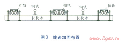 頂管施工對(duì)鐵路運(yùn)輸安全產(chǎn)生不利影響。為保證運(yùn)輸安全暢通,施工中必須對(duì)鐵路線路進(jìn)行加固。加固形式為3-5-3扣軌加固法;加固長(zhǎng)度按保護(hù)管中心考慮受力要求,為25m;扣軌采用50kg/m鋼軌。線路加固、頂進(jìn)施工和拆除加固設(shè)備期間,鐵路行車需限速慢行,設(shè)計(jì)限速為45km/h。拆除加固設(shè)備期間,需對(duì)線路進(jìn)行道床清篩、搗固、順坡整平并補(bǔ)充道砟。頂進(jìn)期間線路方向、高程、水平等須加強(qiáng)檢查。發(fā)現(xiàn)線路有橫移跡象,立即停止頂進(jìn)。有位置條件時(shí),提前設(shè)地錨鋼絲繩牽拉固定線路,以防橫移。線路加固布置見(jiàn)圖3。