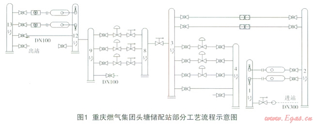 利用前面介紹的方法,對(duì)重慶燃?xì)饧瘓F(tuán)股份有限公司某儲(chǔ)配站進(jìn)行計(jì)算,該儲(chǔ)配站部分工藝流程示意圖見(jiàn)圖1。