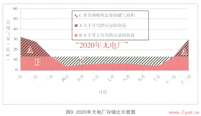 預(yù)計(jì)到2020年,“有電廠”、“無電廠”存儲(chǔ)比分別為:25%、33%,2020有電廠的存儲(chǔ)比最小。既:2020年有電廠、2020年無電廠‘理論季節(jié)調(diào)峰量與年用氣量之比分別為25%、33%,2020年有電廠有情況下需最多存儲(chǔ)年用氣量的25%滿足調(diào)峰需求,存2020年無電廠的情況下需最多存儲(chǔ)年用氣量的33%才能滿足季調(diào)峰的需要。