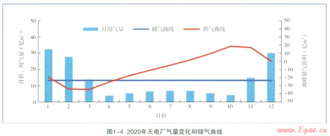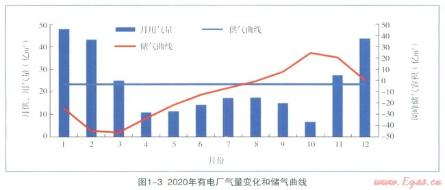 2020年有電廠、2020年無電廠兩種情況供氣曲線、用氣曲線、儲(chǔ)氣設(shè)施工作曲線合成圖分別如圖1-3、1-4所示,圖中供應(yīng)曲線、用氣曲線對(duì)應(yīng)左側(cè)縱坐標(biāo),儲(chǔ)氣曲線對(duì)應(yīng)右側(cè)縱坐標(biāo)。用氣曲線代表負(fù)荷的逐月變化情況,供氣曲線代表氣源在一年內(nèi)連續(xù)均勻供氣,儲(chǔ)氣曲線代表自計(jì)算開始時(shí)算起天然氣供應(yīng)量累計(jì)值與用氣量累計(jì)值之差。