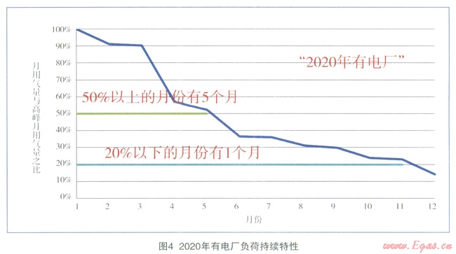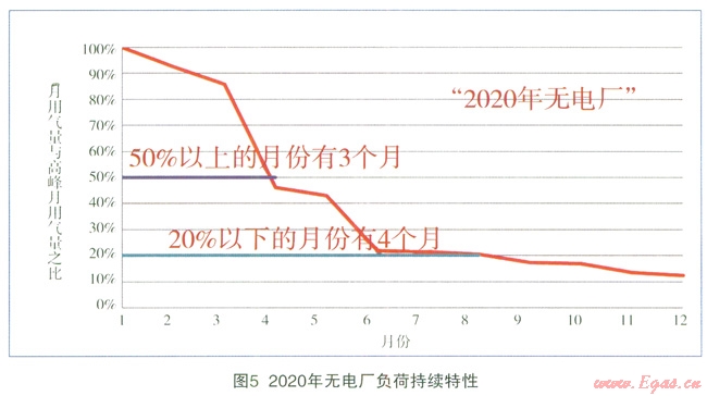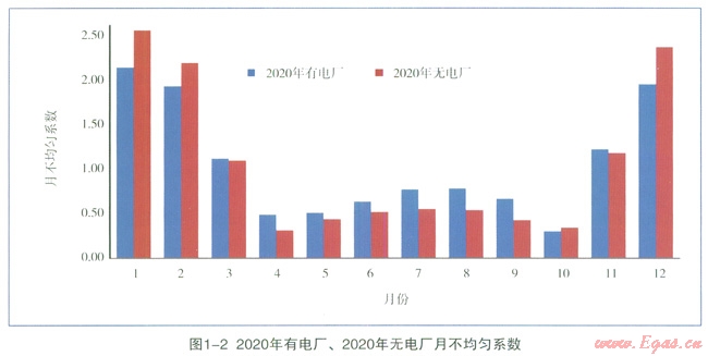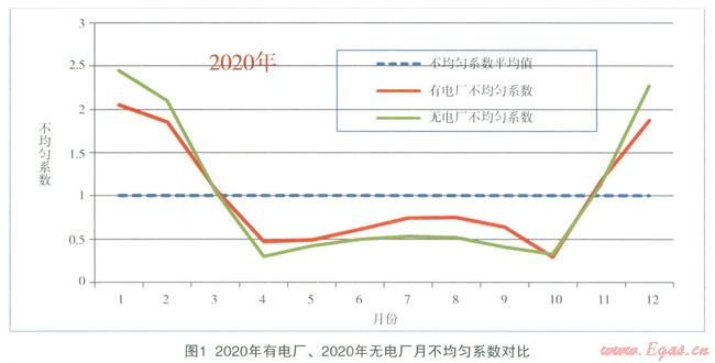 計(jì)算表明:預(yù)計(jì)到2020年,“有電廠”的最大月不均勻系數(shù)為2.05,“無電廠”為2.45,“有電廠”的最大月不均勻系數(shù)最小,“峰值”與“均值”的偏離程度最小,如圖1所示。