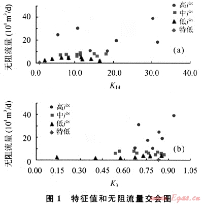 研究表明,測井參數(shù)經(jīng)過適當組合,可提高其與無阻流量的相關(guān)程度[1]。經(jīng)過對測井曲線特征參數(shù)交會圖的分析研究可以得出,筆者擬合的特征值可以較好地反映氣層巖性、物性和含氣性。其中,在已確定儲集層為氣層條件下,綜合特征參數(shù)K14、K11及氣層的有效厚度對產(chǎn)能高低貢獻較大(圖3)。