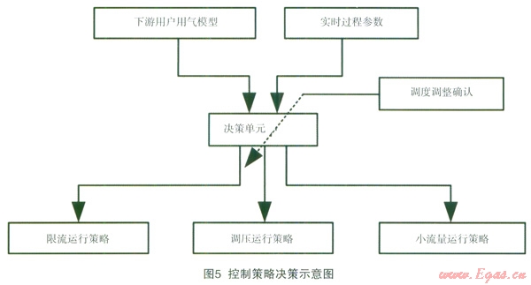 如圖5所示:通過天然氣用氣流量模型,預(yù)測(cè)下游用戶一天內(nèi)天然氣用量的流量-時(shí)間分布數(shù)據(jù),判斷出用氣高峰時(shí)段和低谷時(shí)段,同時(shí)結(jié)合實(shí)際運(yùn)行過程參數(shù)數(shù)據(jù),計(jì)算出相應(yīng)不同時(shí)段的運(yùn)行壓力數(shù)據(jù),在此基礎(chǔ)上調(diào)度人員根據(jù)經(jīng)驗(yàn)做出調(diào)整確認(rèn)后,下載到本地控制器中執(zhí)行具體的控制。