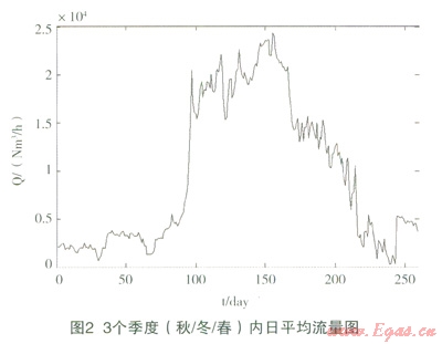 圖1表示:用氣高峰日和非高峰日內(nèi)下游用戶一天內(nèi)用氣量隨時(shí)間的變化過程;圖2表示:一年內(nèi)260天的日平均用氣量。從圖1和圖2中可以看出:高峰日和非高峰日,高峰時(shí)段和非高峰時(shí)段時(shí),天然氣的流量變化范圍很大,在考慮性價(jià)比的情況下,實(shí)際流量計(jì)的選擇必須覆蓋流量上限。由此可能會(huì)出現(xiàn):在用氣量低谷時(shí),實(shí)際運(yùn)行流量接近或低于流量計(jì)下限,從而引起流量的測(cè)量不準(zhǔn)確。