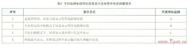 其三,不同電熔焊機對輸入數(shù)據(jù)確認(rèn)功能也存在較大的差異。對于采用條碼等自動輸入?yún)?shù)焊接時,雖然標(biāo)準(zhǔn)允許由操作員或焊機完成數(shù)據(jù)確認(rèn)功能,但是從實際情況來看:不少焊機很難或者無法實現(xiàn)該功能。一方面,如表2所示,有些品牌焊機在焊接前不顯示連接管電阻測量值,如果焊機不具有自動確認(rèn)功能,則是無法實現(xiàn)的。檢測中發(fā)現(xiàn),某些焊機連接管件電阻值與輸入值相差較大時(3W以上),仍允許焊接。甚至某些焊機連接電阻值大于200W電阻時,仍允許焊機工作,這是明顯低于國家標(biāo)準(zhǔn)要求,且具有較大的安全隱患的。另一方面,有些單電壓型電熔焊機缺乏對輸入的焊接電壓進行確認(rèn)。檢測中發(fā)現(xiàn),讀取焊接電壓為35V或42V的條碼時,有些焊機仍輸出電壓為39.5V。因此,既要從標(biāo)準(zhǔn)上提高對焊機的技術(shù)要求,焊機廠家又要認(rèn)識管件識別的重要性。