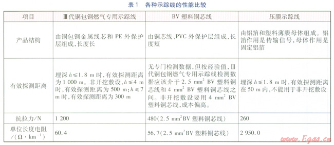 ①摒棄壓膜示蹤線之后,目前較多選用BV塑料銅芯線作為示蹤線代用產(chǎn)品,但因其是非專業(yè)產(chǎn)品,存在成本高、抗腐蝕和抗老化性能差、抗拉力有局限性、長度短致使接頭增多等缺陷。筆者建議可改用Ⅲ代銅包鋼燃?xì)鈱S檬聚櫨€,兇其具有電阻小、抗拉強(qiáng)度高、抗腐蝕和抗老化性能好、長度長可減少接頭、連接處有專用連接防護(hù)接頭等優(yōu)勢,可滿足水平定向鉆敷設(shè)PE燃?xì)夤艿缹κ聚櫨€的要求。根據(jù)中山順康塑料制品公司提供的數(shù)據(jù),對幾種示 蹤線進(jìn)行性能比較,見表1。