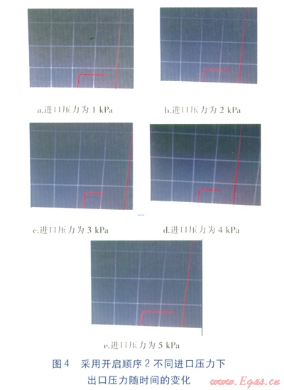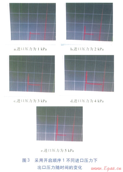 在不同進(jìn)氣壓力p1(1、2、3、4、5kPa)下進(jìn)行試驗(yàn),并記錄出口壓力p2的變化情況,見圖4,橫坐標(biāo)表示時間,縱坐標(biāo)表示p2。由圖4可知,采用開啟順序2時,出口壓力p2比較穩(wěn)定,隨著進(jìn)口壓力p1升高,出口壓力p2仍然比較穩(wěn)定,沒有出現(xiàn)過沖現(xiàn)象。