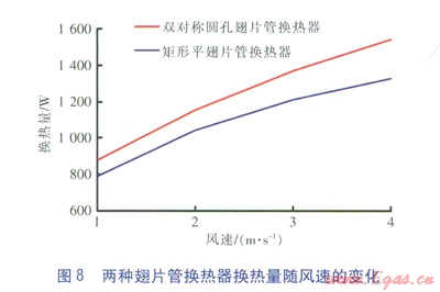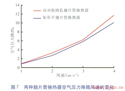 對稱圓孔翅片管具有優(yōu)越的強化傳熱效果。風速范圍為l~4m/s時,與矩形平翅片管換熱器相比,對稱圓孔翅片管換熱器的換熱量平均提高了12.8%,空氣壓力降提高并不明顯。