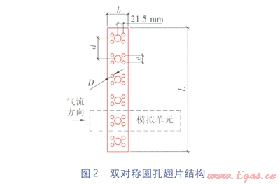 研究對象選取單排換熱管的矩形平翅片管換熱器、雙對稱圓孔翅片管換熱器,幾何尺寸按照文獻[7]中實驗樣件的尺寸確定,基本尺寸:換熱管外徑Do為25mm,翅片厚度d為0.5mm,換熱管間距d為76mm,翅片間距s為10mm,翅片寬度b為6lmm,翅片長度L為296mm,圓孔間距e為26mm,圓孔直徑D為14mm。兩種翅片管換熱器的翅片數(shù)均為28片,矩形平翅片管換熱器總換熱面積為1.1139m2,雙對稱圓孔翅片管換熱器總換熱面積為1.1089m2。由于翅片管換熱器所有翅片幾何結(jié)構(gòu)相同,為了簡化研究,取單個翅片作為研究對象,根據(jù)對稱特性,取其中的一個區(qū)域作為模擬單元進行研究。矩形平翅片、雙對稱圓孔翅片結(jié)構(gòu)分別見圖1、2。