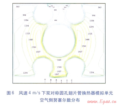 風速4m/s下兩種模擬單元空氣側(cè)努塞爾數(shù)分布見圖5、6。由圖5、6可知,矩形平翅片管換熱器模擬單元空氣側(cè)努塞爾數(shù)的最大值出現(xiàn)在換熱管的兩側(cè),雙對稱圓孔翅片管換熱器模擬單元的最大值出現(xiàn)在流動的起始位置;最小值均出現(xiàn)在換熱管后尾流區(qū)。在相近位置上,雙對稱圓孔翅片管換熱器模擬單元空氣側(cè)努塞爾數(shù)明顯高于矩形平翅片管換熱器模擬單元,這說明前者的傳熱性能優(yōu)于后者。