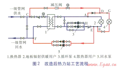 熱力站一級側(cè)供、回水溫度為100、60℃,改造前熱力站二級側(cè)(僅有地板輻射供暖用戶)供、回水溫度為50、40℃,擬增加的散熱器用戶供回水溫度為80、60℃。改造前后熱力站工藝流程分別見圖1、2。由圖1、2可知,改造后,散熱器用戶一部分供水由換熱器二級側(cè)供水管道引出,另一部分供水由換熱器一級側(cè)供水管道引出。由一級側(cè)供水管道引出的熱水經(jīng)減壓閥、電動調(diào)節(jié)閥后,與由二級側(cè)供水管道引出的熱水混合,作為散熱器用戶的供水。散熱器用戶回水與地板輻射供暖用戶回水混合后,一部分回到換熱器二級側(cè)回水管道,另一部分回到一級側(cè)回水管道。改造后二級側(cè)補水可由一級側(cè)補充,因此二級側(cè)原有補水裝置(補水泵、水處理裝置等)可取消?;厮昧髁颗c管道CD流量一致。經(jīng)校核,新增散熱器用戶的流量未超出循環(huán)泵的裕量,不影響地板輻射用戶流量。