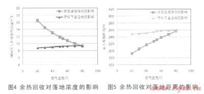 該項煙氣余熱回收技術(shù)對污染物擴(kuò)散的影響可以從兩個方面分析,隨著排煙溫度的降低,一方面:煙氣余熱回收量逐漸增大,供相同的熱量節(jié)省了燃料,燃料的節(jié)省會使NOx排放速率減小,NO2的最大落地濃度減??;另一方面,隨著煙氣溫度的降低,污染物不宜擴(kuò)散,煙氣本體的NO2的最大落地濃度增加,兩種因素的作用一正一負(fù),因此需要對兩方面分別分析其綜合效果。