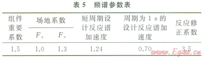 根據(jù)XX管道給出的地震資料,可根據(jù)GB 5001l《建筑抗震設(shè)計(jì)規(guī)范》查得土地的特征周期、水平地震影響系數(shù)最大值等參數(shù),根據(jù)SS(4%阻尼系數(shù))和S1(4%阻尼系數(shù))的值,分別在ASCE 7-05規(guī)范中表11.4.1和11.4.2查得場(chǎng)地系數(shù)Fa和Fv。在CAESARⅡ軟件的頻譜分析模塊輸入相關(guān)的地震頻譜參數(shù),軟件計(jì)算后會(huì)生成頻譜分析結(jié)果圖。XX管道所在的地震區(qū)域頻譜參數(shù)如表5所示,頻譜分析結(jié)果如圖3所示,工況組合情況如表6所示[18-22]。
