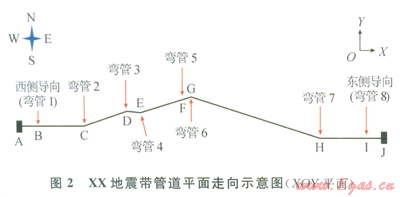 管道總長(zhǎng)度約為780m,起點(diǎn)和終點(diǎn)分別設(shè)置固定墩l、2,用以截?cái)嘌芯繉?duì)象外管道對(duì)模型的影響。西側(cè)進(jìn)土導(dǎo)向B前有30m長(zhǎng)的管段,與入土處有30°的偏離;西側(cè)水平管段長(zhǎng)約為110m,斜管總長(zhǎng)約為215m;東側(cè)出土導(dǎo)向工后有30m長(zhǎng)的管段,與出土處有30°的偏離;東側(cè)水平管段長(zhǎng)為105m,斜管長(zhǎng)約為290m。管道均采用大開(kāi)挖的敷設(shè)方式,彎管的曲率半徑(R)為6D(D為管道外徑),地區(qū)等級(jí)為l級(jí),設(shè)計(jì)系數(shù)為0.72。管道為空間結(jié)構(gòu),在X、Y、Z方向上均有長(zhǎng)度分量,其在XOY平面上的走向如圖2所示,具體空間參數(shù)如表4所示。