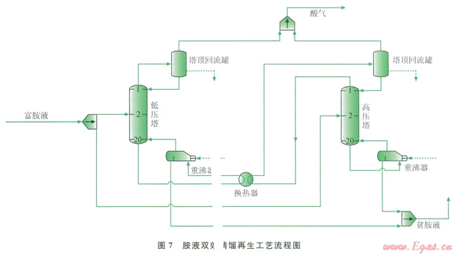7為應用ProMax軟件模擬醇胺溶液雙效精餾再生工藝流程。將胺液再生過程分為高、低壓2個再生塔,高、低壓塔分別得到等量從吸收塔中出來的醇胺溶液,各塔處理量為原再生塔的一半。在高壓塔頂增加冷凝器,并在低壓塔底配置再沸器,以避免低壓塔的塔底液體加熱量達不到分離要求所需的溫度,同時避免高壓塔頂?shù)臍怏w冷卻量達不到冷卻量要求。