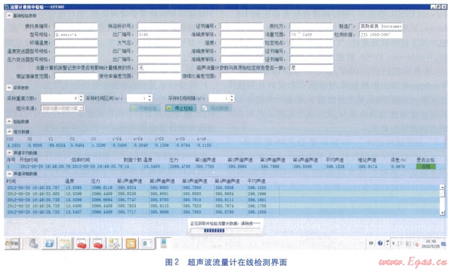 在線監(jiān)測系統(tǒng)根據(jù)JJG l030—2007《超聲波流量計》中有關(guān)以聲速比較為基礎(chǔ)的在線檢測相關(guān)要求,內(nèi)置了AGAl0聲速計算模塊,可一鍵完成對超聲波流量計的在線檢測。超聲波流量計在線檢測界面見圖2。