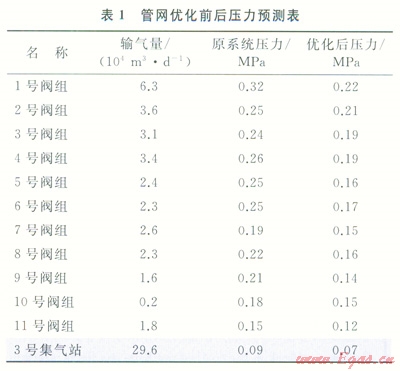 2號閥組—4號閥組—節(jié)點2—11號閥組建復線(圖2),管網(wǎng)優(yōu)化前后壓力預測情況見表1。
